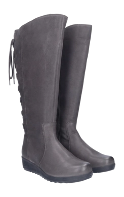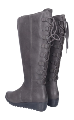 Der stylische Akins Stiefel der Marke JJ Footwear hat einen dezenten Keilabsatz und ist aus Leder gefertigt. Der Stiefel hat eine Schafthöhe von 39 cm und hat ein herausnehmbares Fußbett. Der Stiefel hat einen trendigen Look und ist angenehm unter einem Kleid zu tragen. Der Stiefel hat eine schöne Schnürung auf der Rückseite, mit der Sie die Passform anpassen können. Der Akins Damenstiefel eignet sich für Damen mit einer Wadenweite von M/L und hat eine Fußweite der Klasse H.