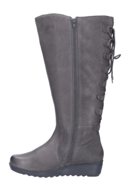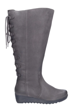 Der stylische Akins Stiefel der Marke JJ Footwear hat einen dezenten Keilabsatz und ist aus Leder gefertigt. Der Stiefel hat eine Schafthöhe von 39 cm und hat ein herausnehmbares Fußbett. Der Stiefel hat einen trendigen Look und ist angenehm unter einem Kleid zu tragen. Der Stiefel hat eine schöne Schnürung auf der Rückseite, mit der Sie die Passform anpassen können. Der Akins Damenstiefel eignet sich für Damen mit einer Wadenweite von XL und hat eine Fußweite der Klasse H.