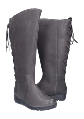 Der stylische Akins Stiefel der Marke JJ Footwear hat einen dezenten Keilabsatz und ist aus Leder gefertigt. Der Stiefel hat eine Schafthöhe von 39 cm und hat ein herausnehmbares Fußbett. Der Stiefel hat einen trendigen Look und ist angenehm unter einem Kleid zu tragen. Der Stiefel hat eine schöne Schnürung auf der Rückseite, mit der Sie die Passform anpassen können. Der Akins Damenstiefel eignet sich für Damen mit einer Wadenweite von XXL und hat eine Fußweite der Klasse H.