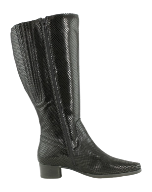 Diese schönen Stiefel von JJ Footwear namens Laguna zeichnen sich durch Ihren besonderen Schlangenleder-Look aus.. Die Stiefel sind mit einer Absatzhöhe von 3,5 cm nicht zu hoch, aber verleihen Ihnen trotzdem noch eine weibliche Note. Verschließen lassen sich die Stiefel mit einem Reißverschluss und sind außerdem mit einer elastischen Einkerbung versehen – so passt sich der Stiefel perfekt an Ihre Wade an. Mit diesen wunderschönen Qualitätsstiefeln ziehen Sie die Blicke auf sich. Diese Stiefel sind etwas ganz besonderes.